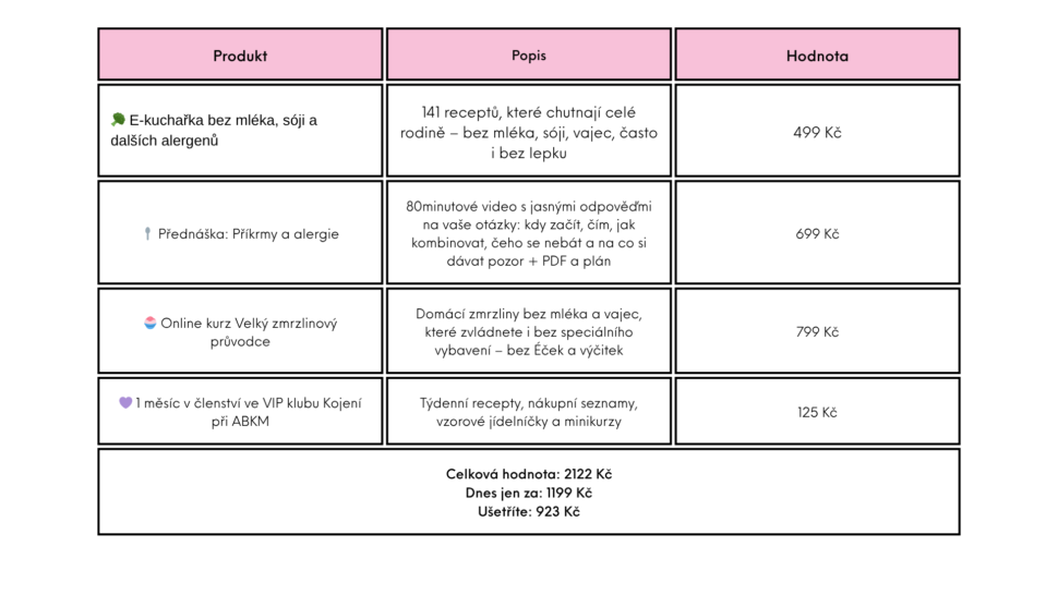 Omrkněte ještě letní balíček, ve kterém najdete dalších 10 vzoroých jídelníčků, 250+ jednoduchých a výživných receptů, průvodce zaváděním příkrmů u alergiků a mnoho dalšího 👇